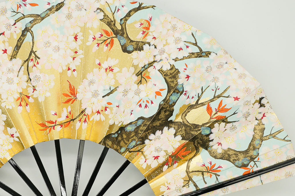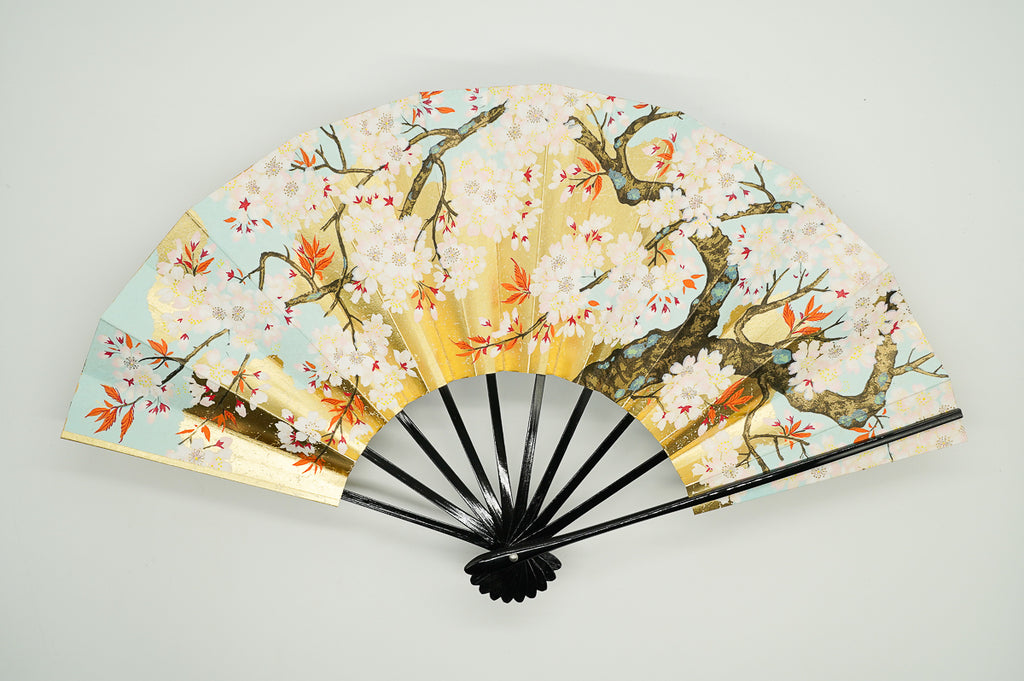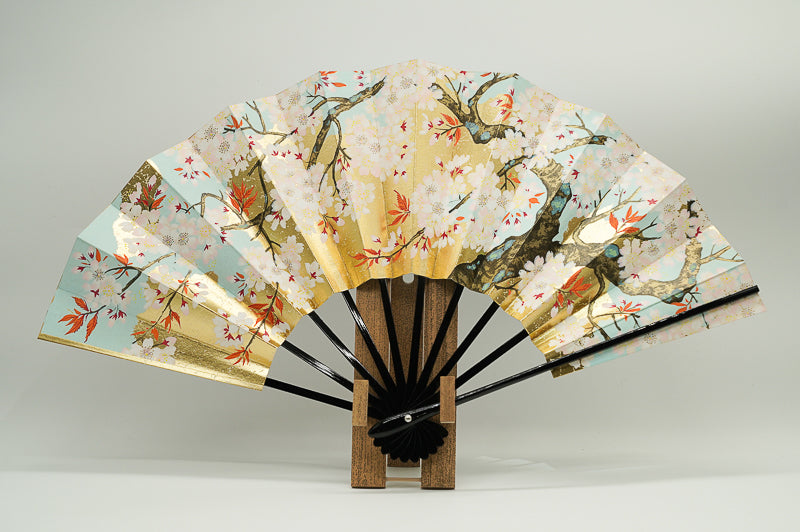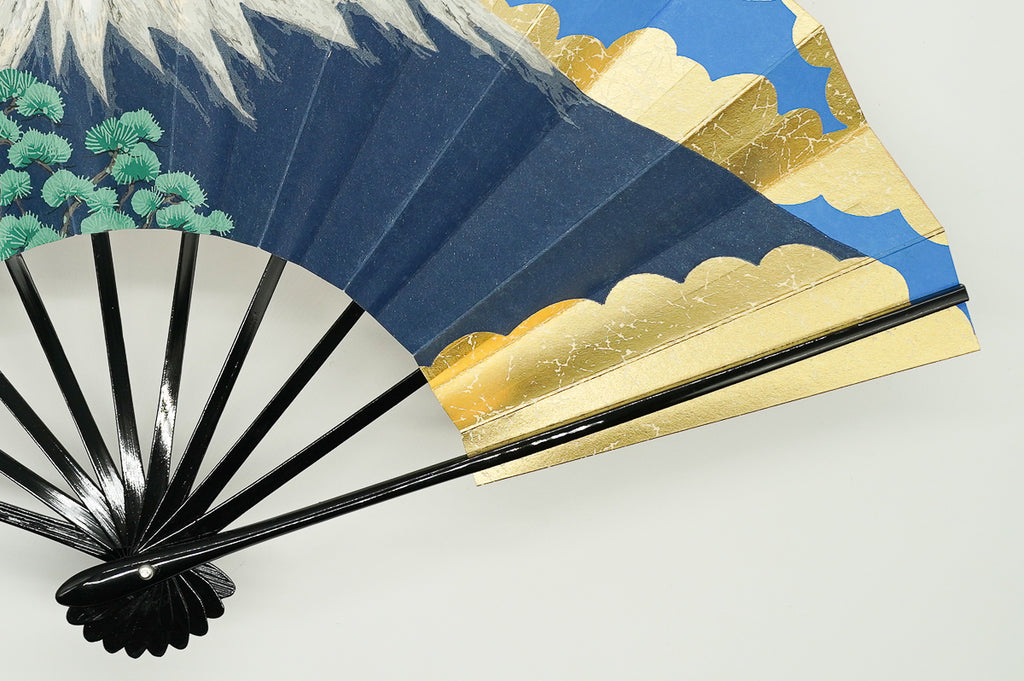 金もみ地の扇面に富士山と金の雲、松、もう片面には金箔地に桜が描かれています。日本の象徴である富士山と桜は外国の方にも人気があり、日本土産や贈物にもぴったりのデザインです。季節やお好みに合わせて両面お使いいただけます。