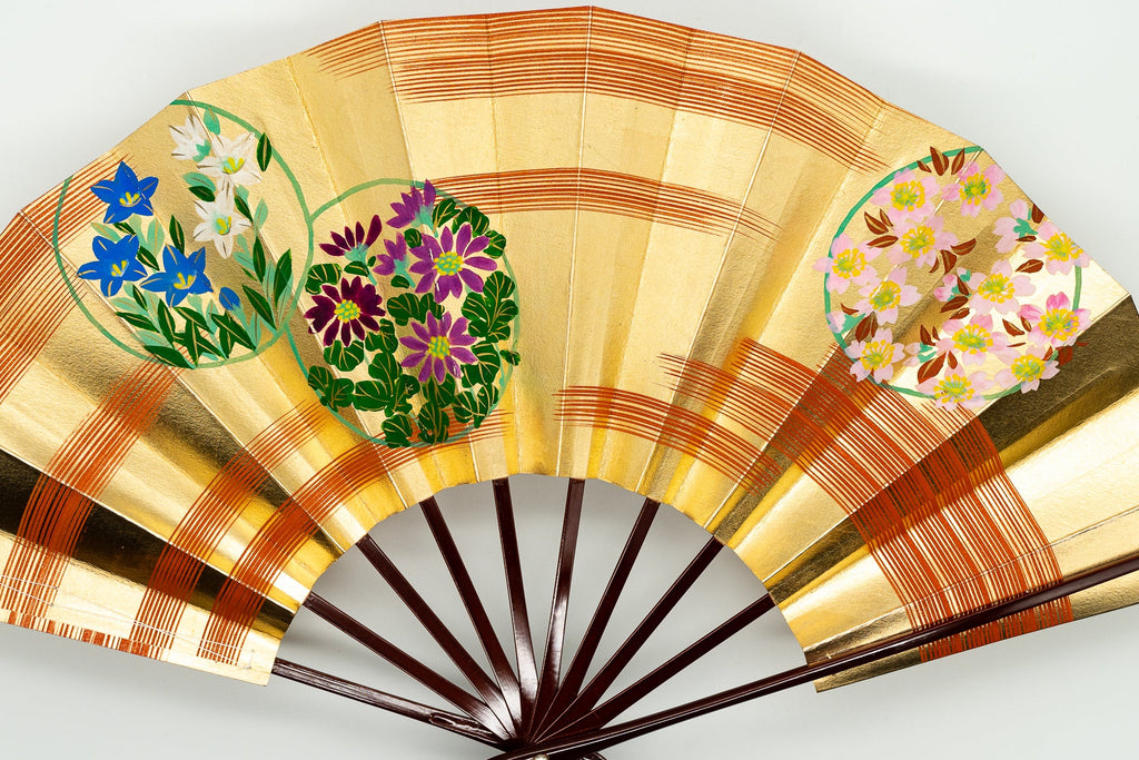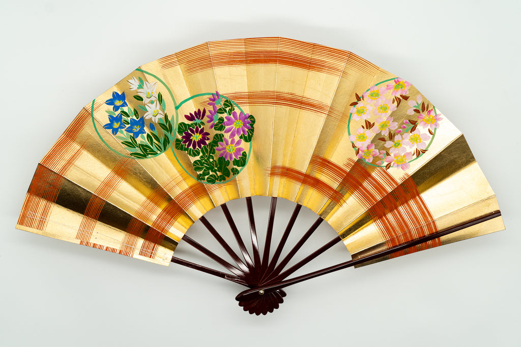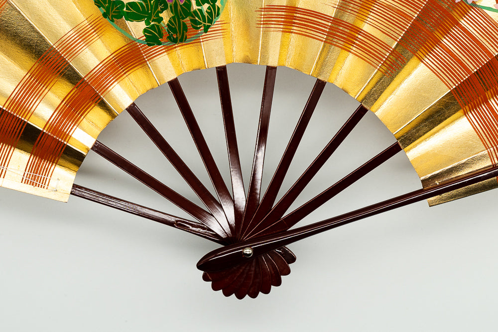 上質な金箔地の扇面に手描きで花丸文が描かれています。花丸文様は円(縁)がつながるとされ、大変縁起の良い文様として古くから日本で愛好され伝えられてきた伝統文様です。華やかさと可愛らしさの感じられる一品です。