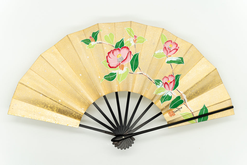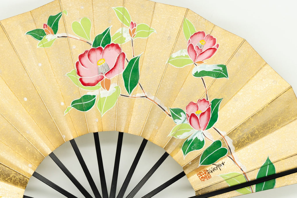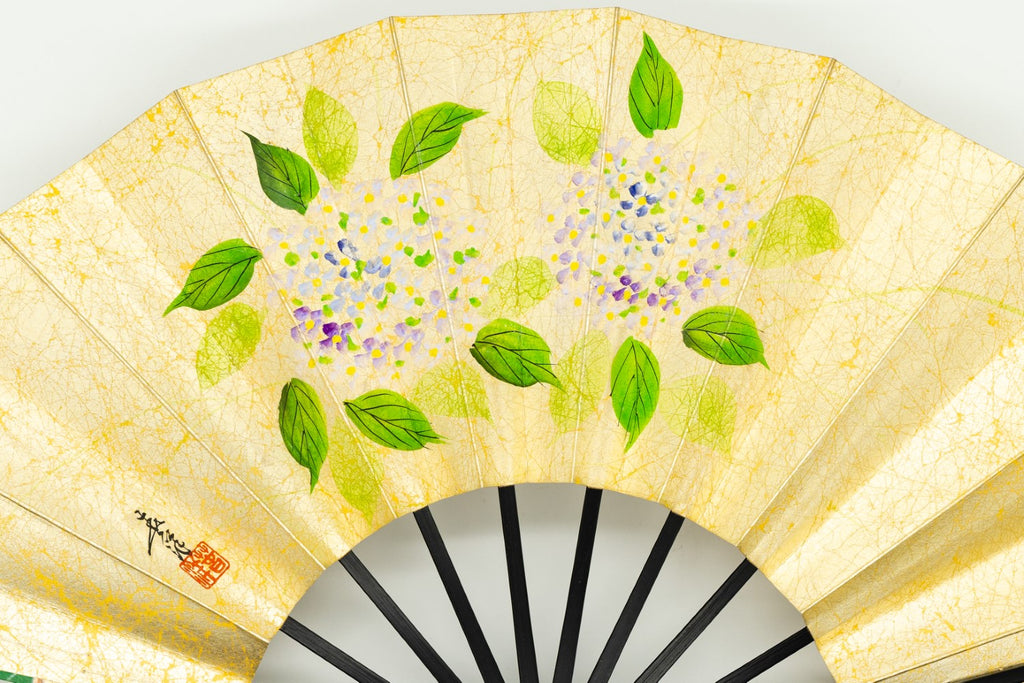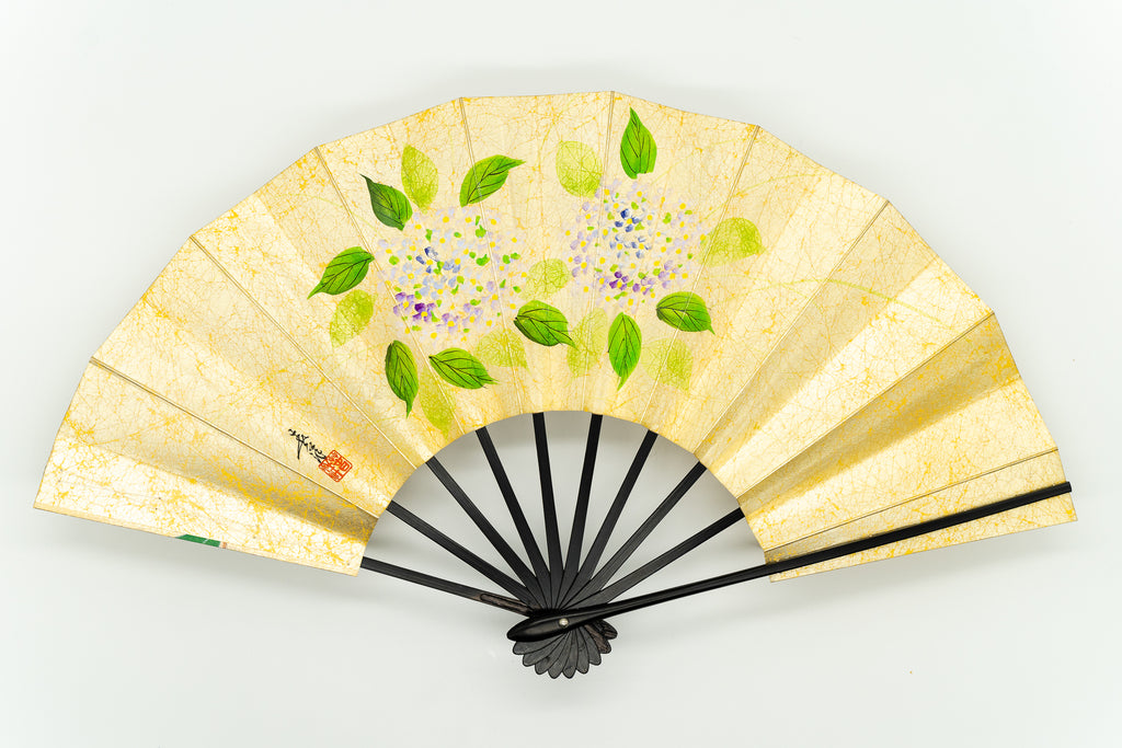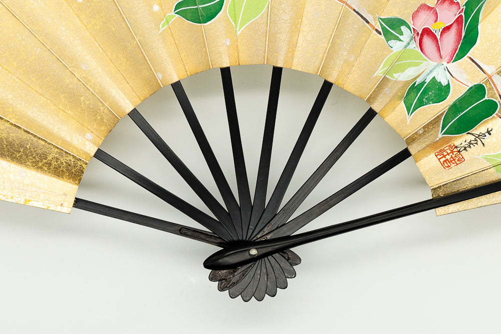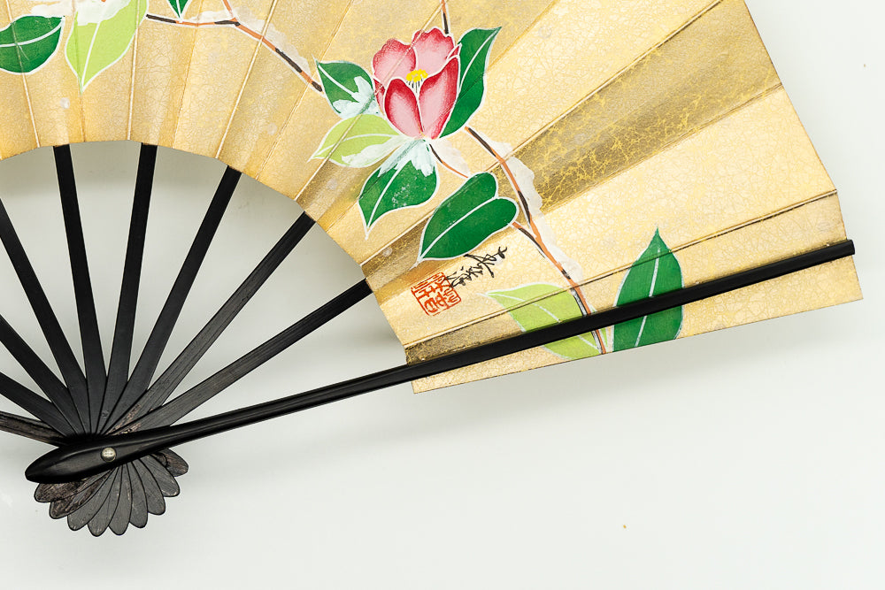 【一点もの・ビンテージ品】上質な金もみ地に爽やかな印象の紫陽花、もう片面は可憐な雪椿が手描きで描かれています。上品な色調と控え目な絵柄でインテリアに取入れやすく季節に合わせて両面お使い頂けます。ゴールドが経年変化によりシックなお色味になっており、ビンテージ品らしい趣を楽しんで頂ける一品です。