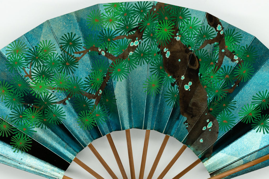【ビンテージ品】片面に富士山と鶴、片面に松が手描きで描かれています。深みのある青貝箔地の色調が美しく、モダンな雰囲気もあわせ持った珍しい一品です。