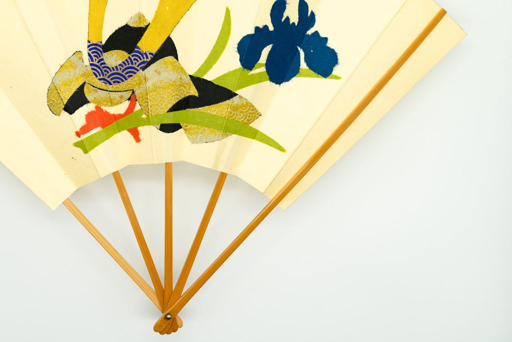 【一点もの】蝙蝙蝠扇は平安時代に生まれ、古くは紙扇・紙張り扇の総称でした。扇を開いた形がコウモリの羽に似ているからとも言われています。フォルムが美しく、インテリアに取入れやすいちょうど良いサイズでおしゃれに飾っていただけます。こちらは鳥の子地の扇面に和紙のちぎり絵で兜が描かれています。ちぎり絵が立体的で柔らかな雰囲気を醸し出しています。