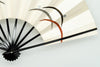 パール地の扇面に黒・グレー・茶の3色で露芝を表現しました。半円弧に描かれた芝草の上で露の雫が玉のように宿る様を描いています。