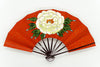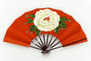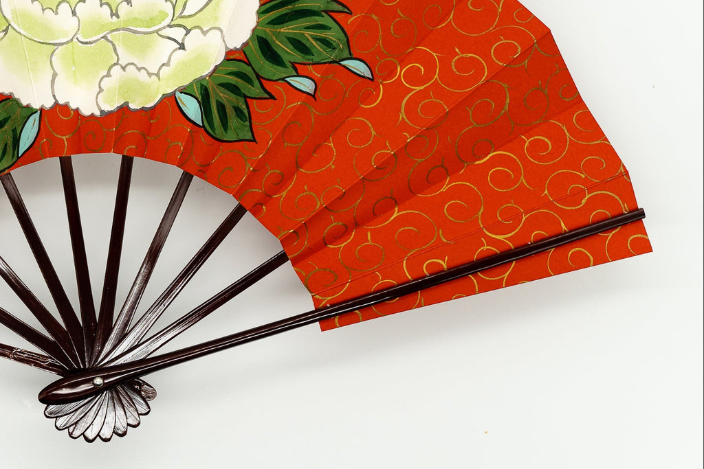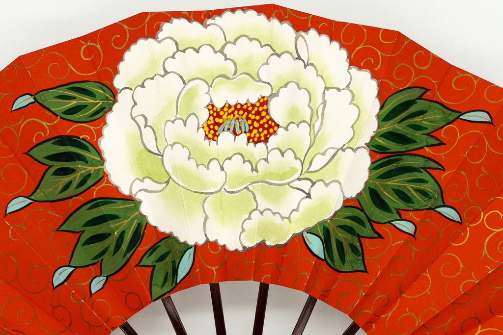 朱色に金の唐草模様の地紙、中央に大ぶりの白い一輪牡丹が手描きで描かれています。色鮮やかでパッと目を引く存在感のある仕上がりとなっています。