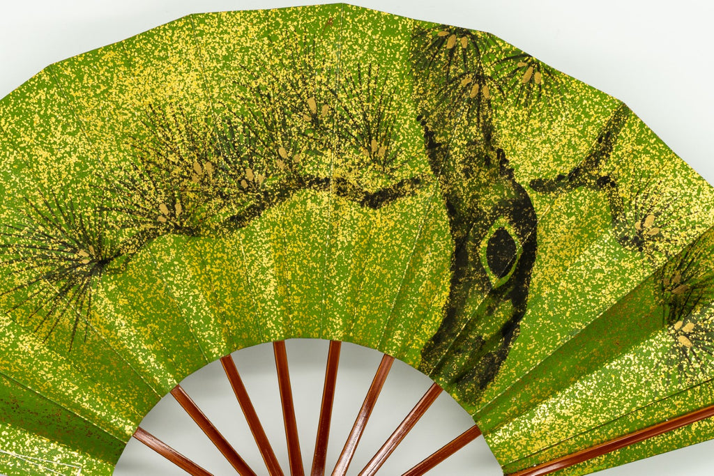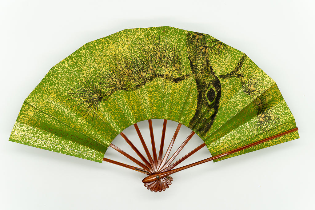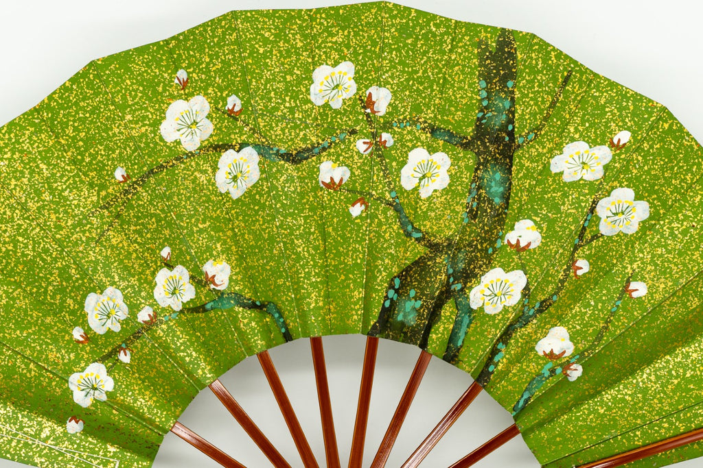 一面金砂子の地紙に松、もう片面には白梅が手描きで描かれています。金砂子と墨絵の松の調和が美しく、白梅は花びらが浮き立つように表現されています。春慶塗りの骨が上品にマッチして扇面のデザインを引き立たせています。
