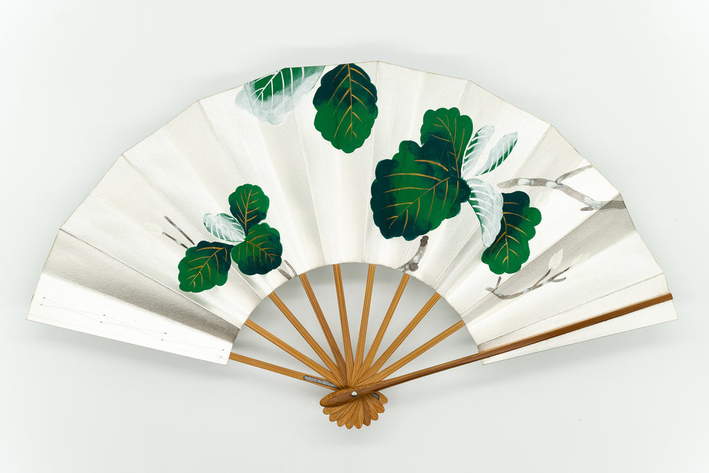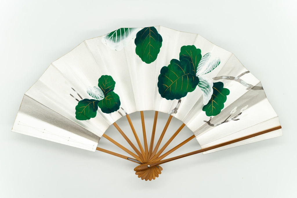 【ビンテージ品】銀ハキ地に波打つような葉の形が印象的な柏の葉が色鮮やかに描かれています。柏は秋になっても落葉せず新しい芽が出るまで葉が落ちないことから子孫繁栄を願う縁起物とされています。