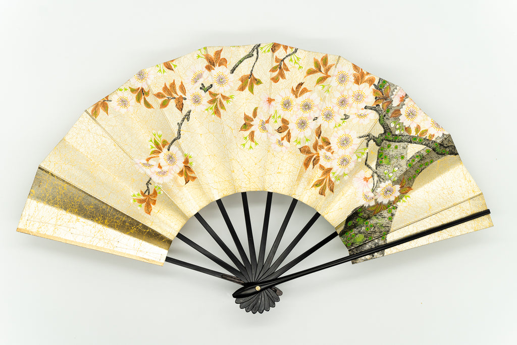 上質な金もみ地に落ち着いた上品な色調の桜、もう片面には御所車と秋草があしらわれています。季節に合わせて通年ご利用頂けます。