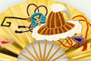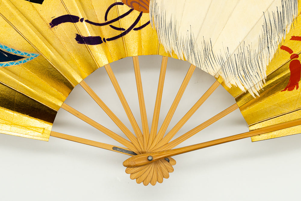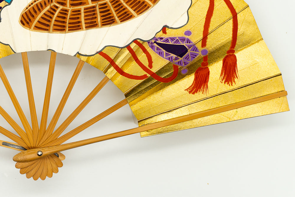 【一点もの・ビンテージ品】地紙に純金(24k)の金箔を使用しており、力強く美しい輝きを放っています。日本舞踊の演目「蓬莱」で使用される宝物を描いた特別な絵柄で大変に珍しいお品です。古来より金は豊かさと権力の象徴であり、風水でも「富」「繁栄」「成功」を意味し金運や運気上昇に効果的とも言われています。