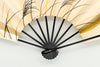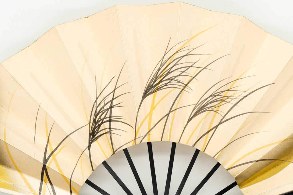 パールベージュの地紙に金のぼかしで満月、手描きでススキを描いて十五夜の美しさを表現しています。仲秋の名月に映えるススキには邪気を払う力があり、災いを遠ざけて次の年の豊作を願うという意味も込められています。