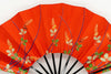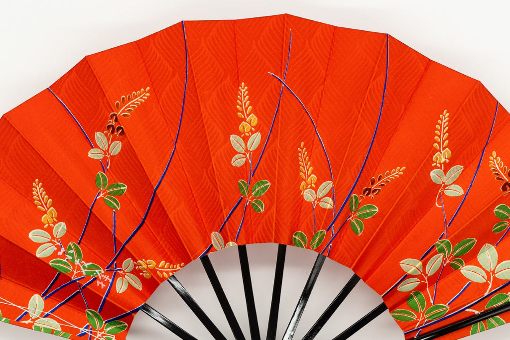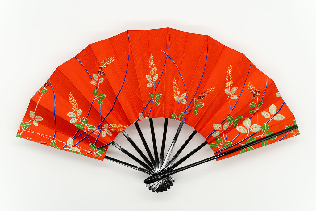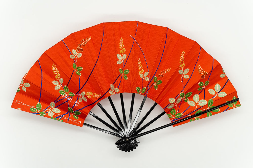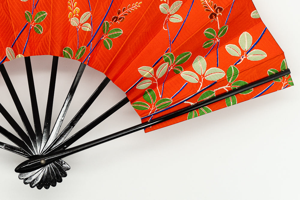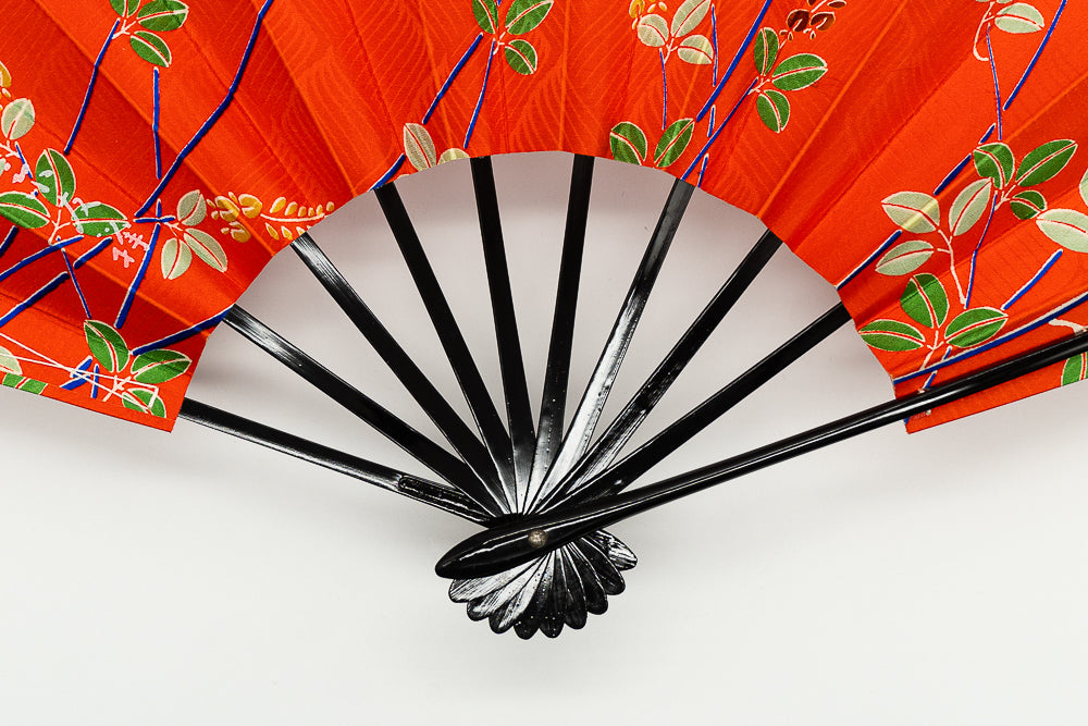 【一点もの】京友禅を扇に仕立てた珍しいお品です。布地ならではの質感や紗綾形(さやかた)文様が美しく、鮮やかな朱色をお楽しみ頂けます。
