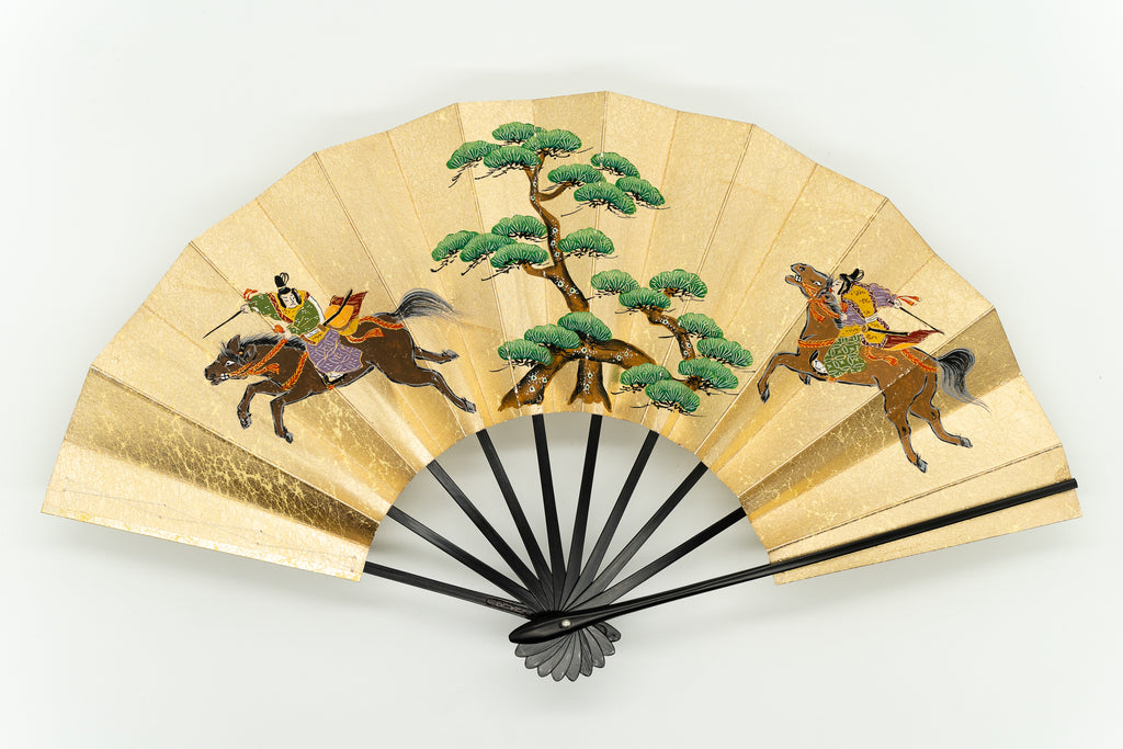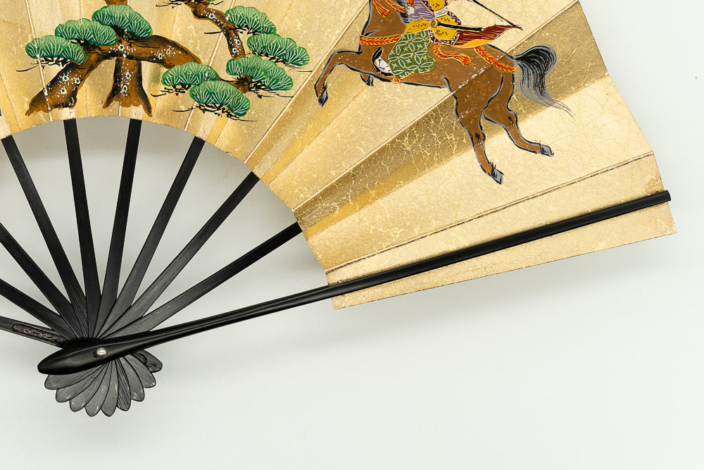 【ビンテージ】上質な金もみ地に古式競馬の様子が躍動的に描かれています。お扇子の絵柄としては珍しく手描きならではの味わい深さを楽しんで頂ける作品です。
