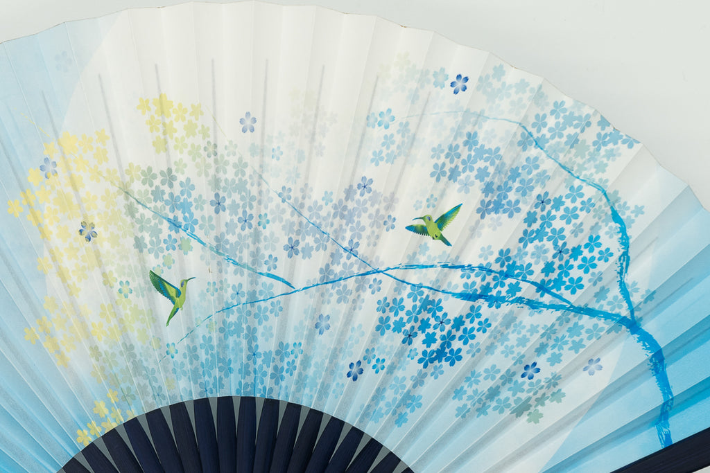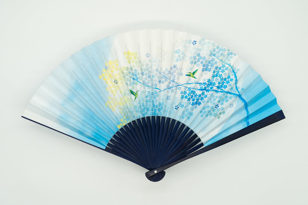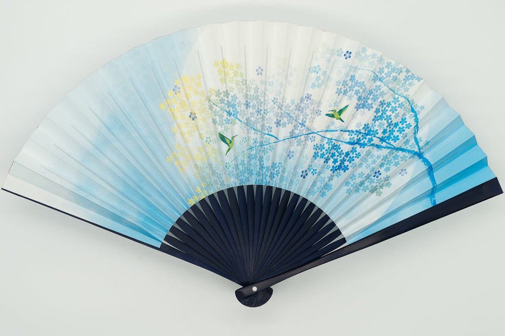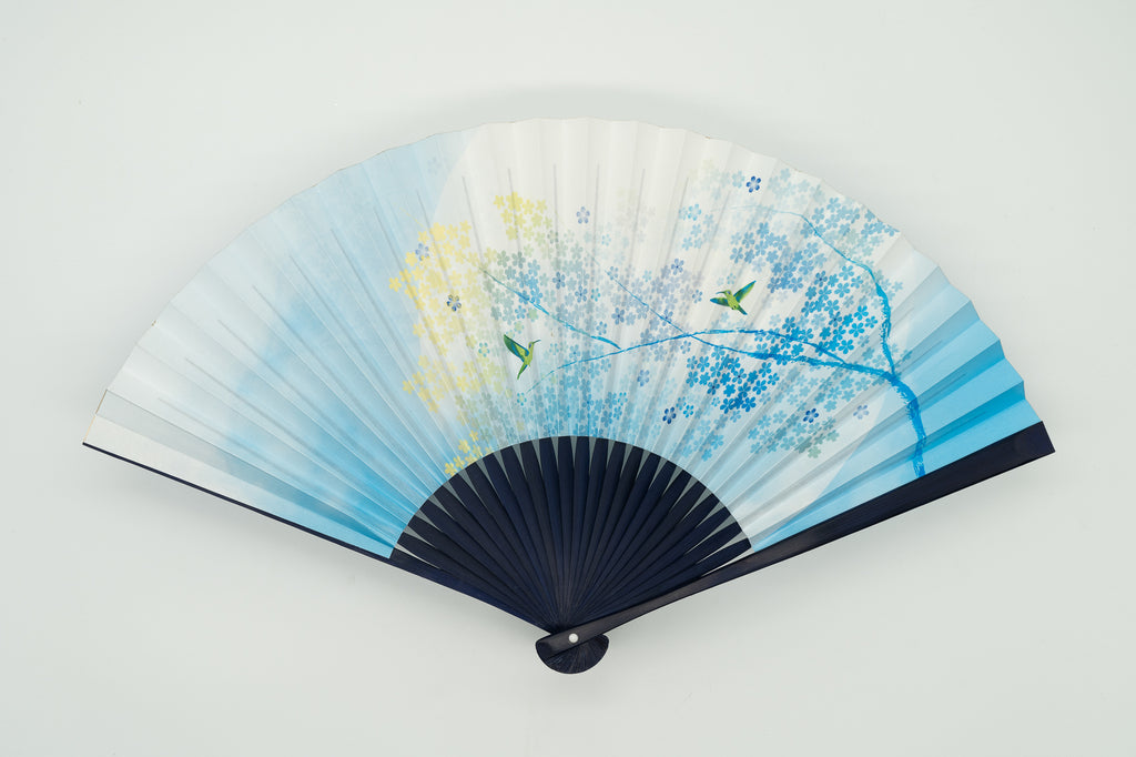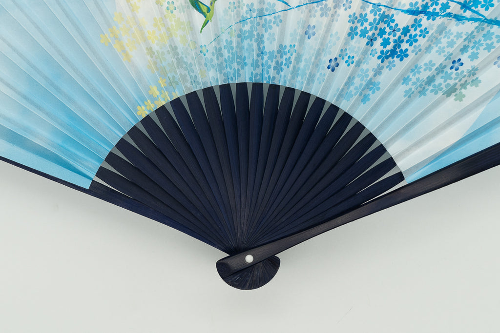 The ribs are dyed navy blue to match the design of the fan surface, creating a harmonious whole.