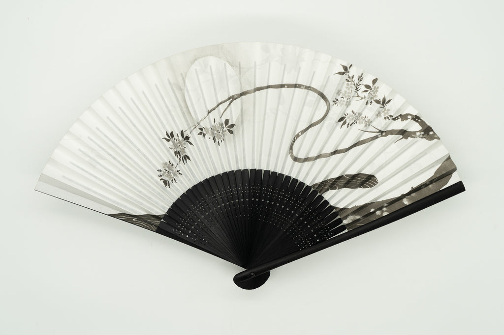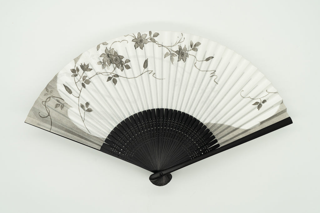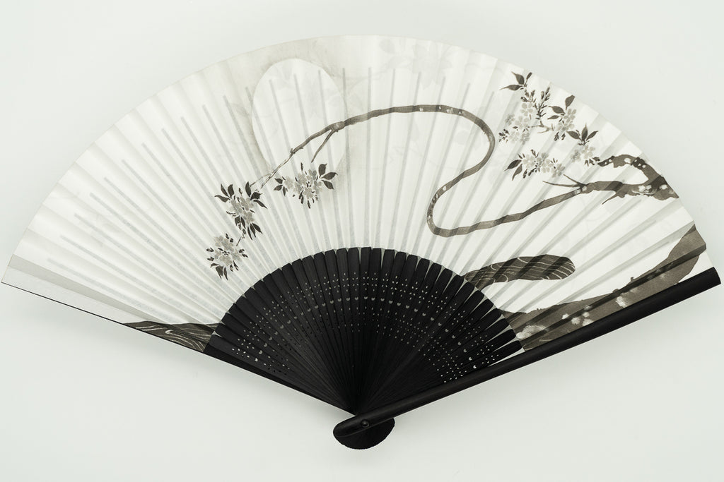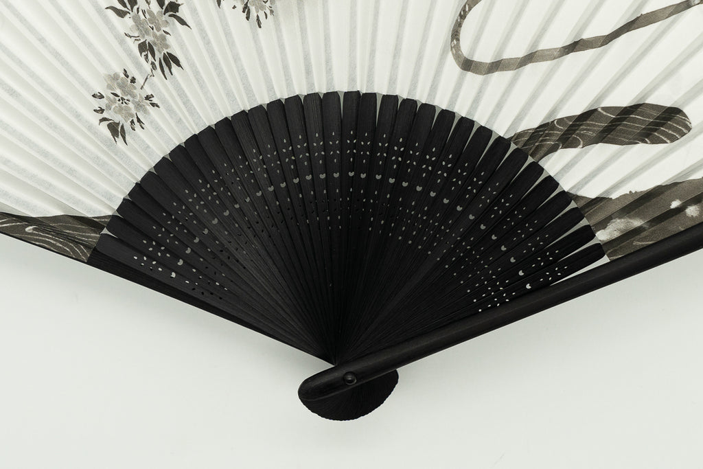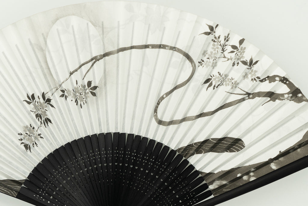 The front side features cherry blossoms and the back side features iron wire flowers in monochrome, creating a modern fan with a chic atmosphere.