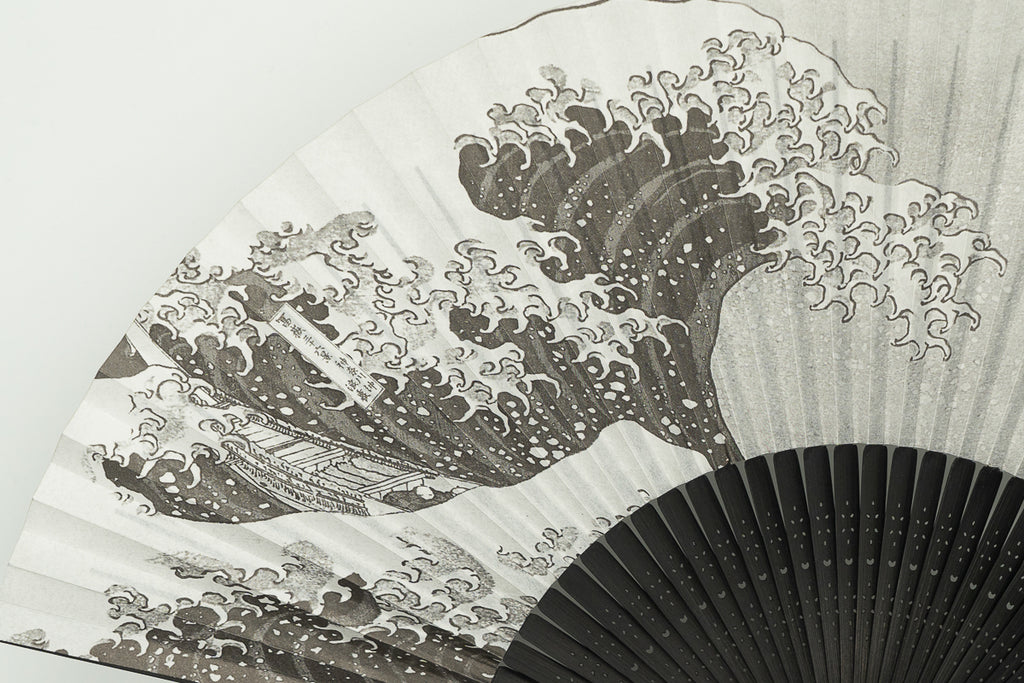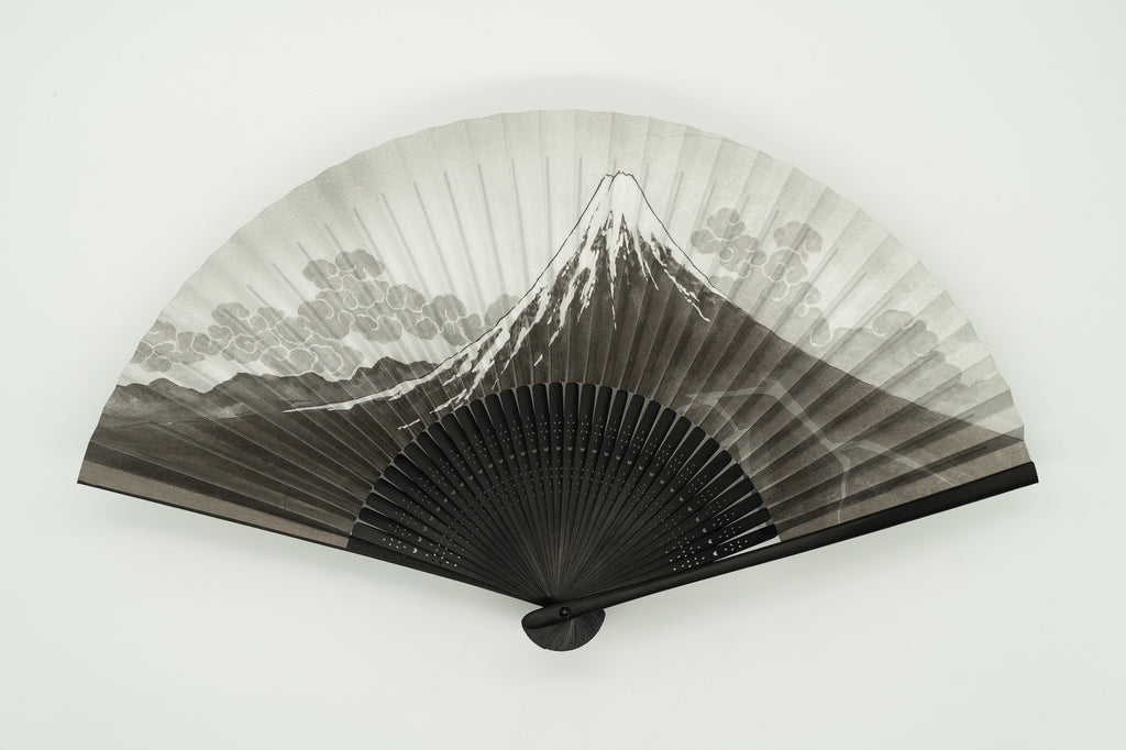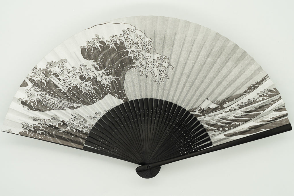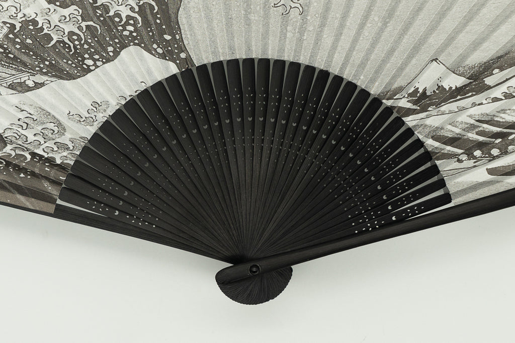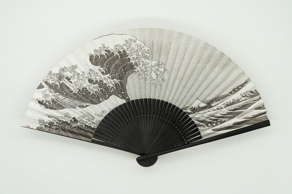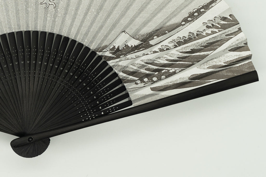This paper fan for men is made using traditional Kyoto techniques and features a bold design of waves on the front and a red Fuji pattern on the back.