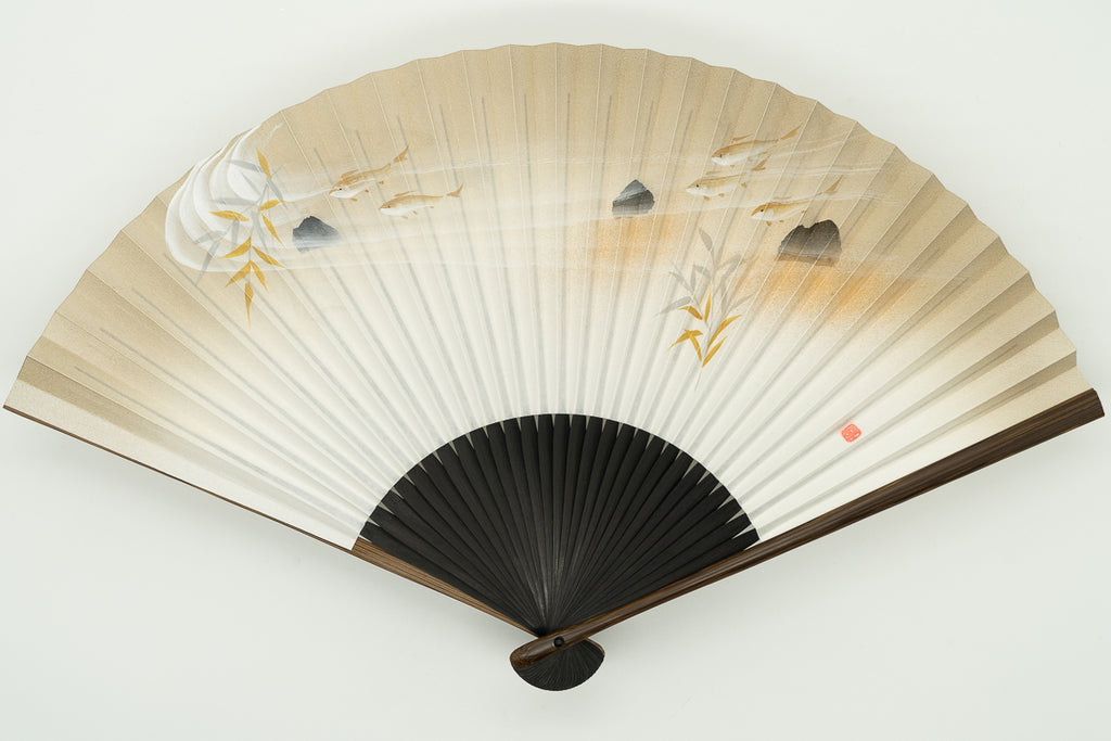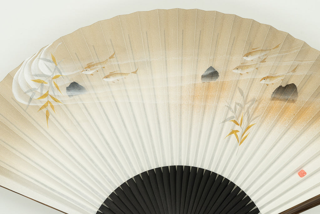 Ayu fish swimming in a clear stream are depicted with a delicate touch, creating a cool and elegant atmosphere.