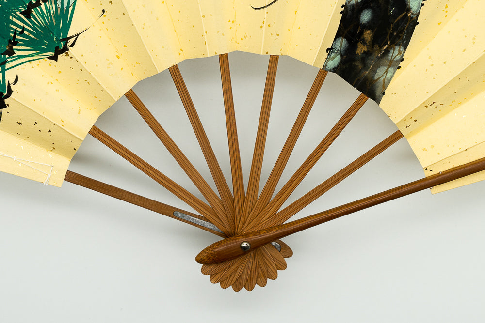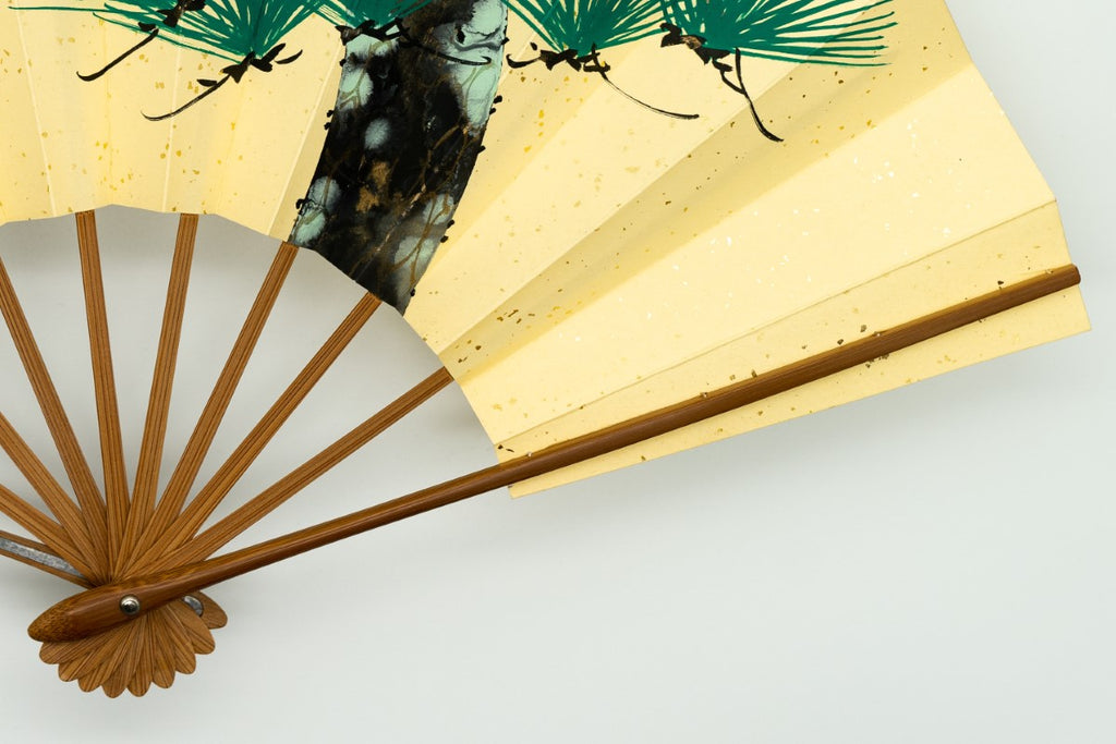 鳥の子地の扇面に一面金砂子振り、手描きで松が描かれています。
