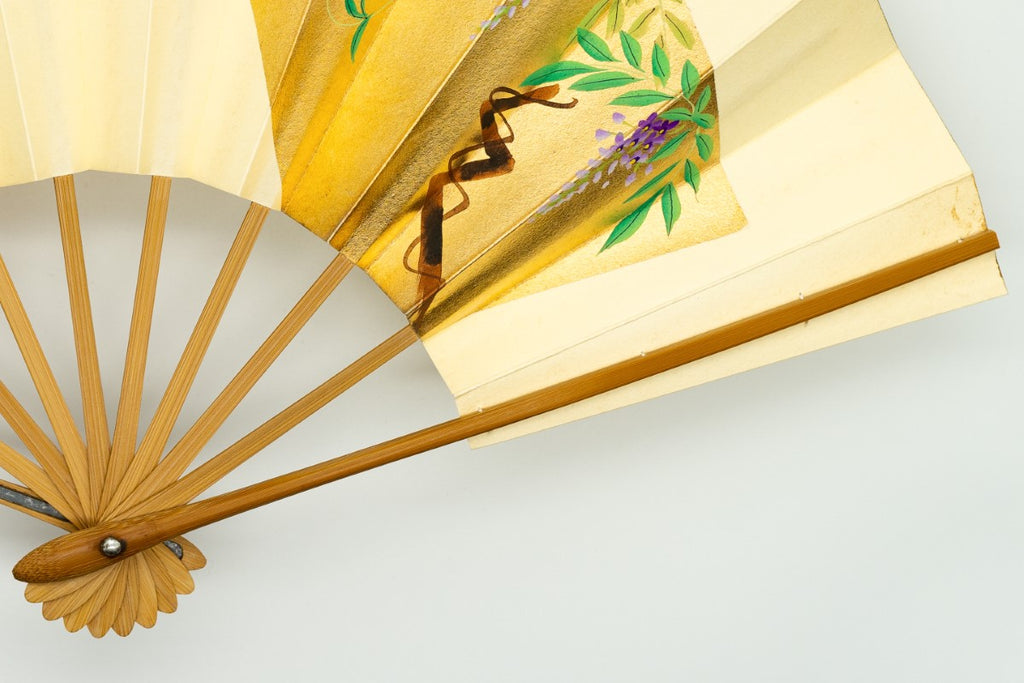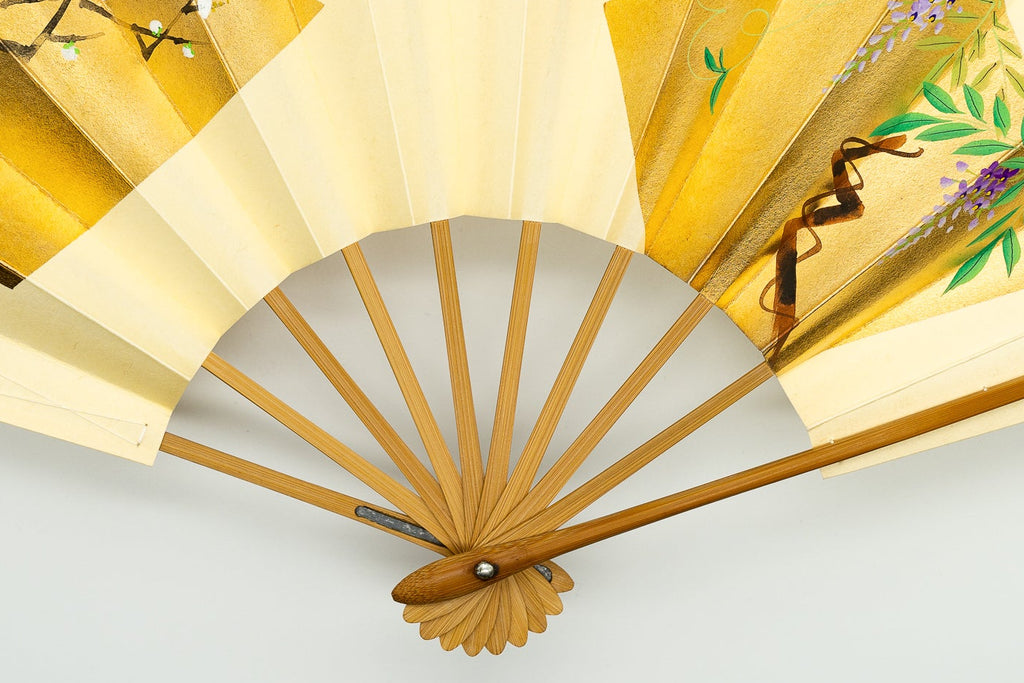 【ビンテージ】鳥の子地の扇面に金箔色紙に四季の花が手描きで描かれています。両面お使い頂け、季節に合わせて梅、桜、藤、桔梗の絵柄が楽しめる一品です。