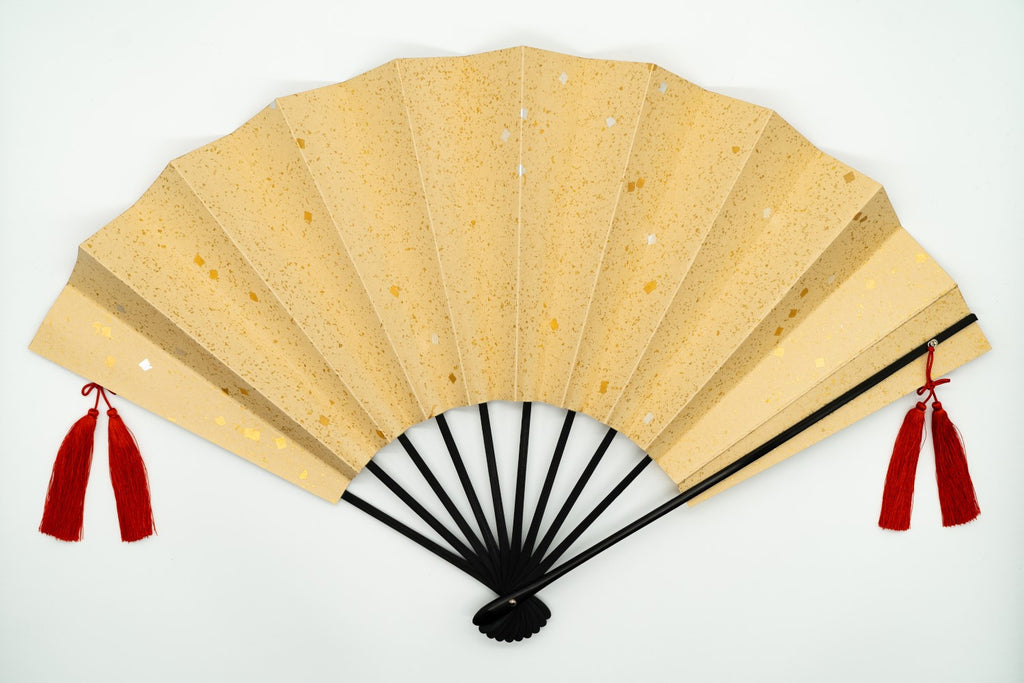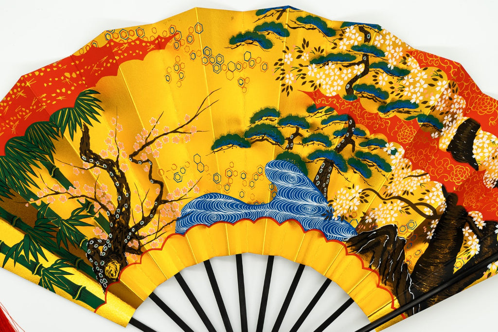 金箔地の扇面に松竹梅が描かれています。大きく幅広で迫力があり、外国の方にも人気のあるお品です。