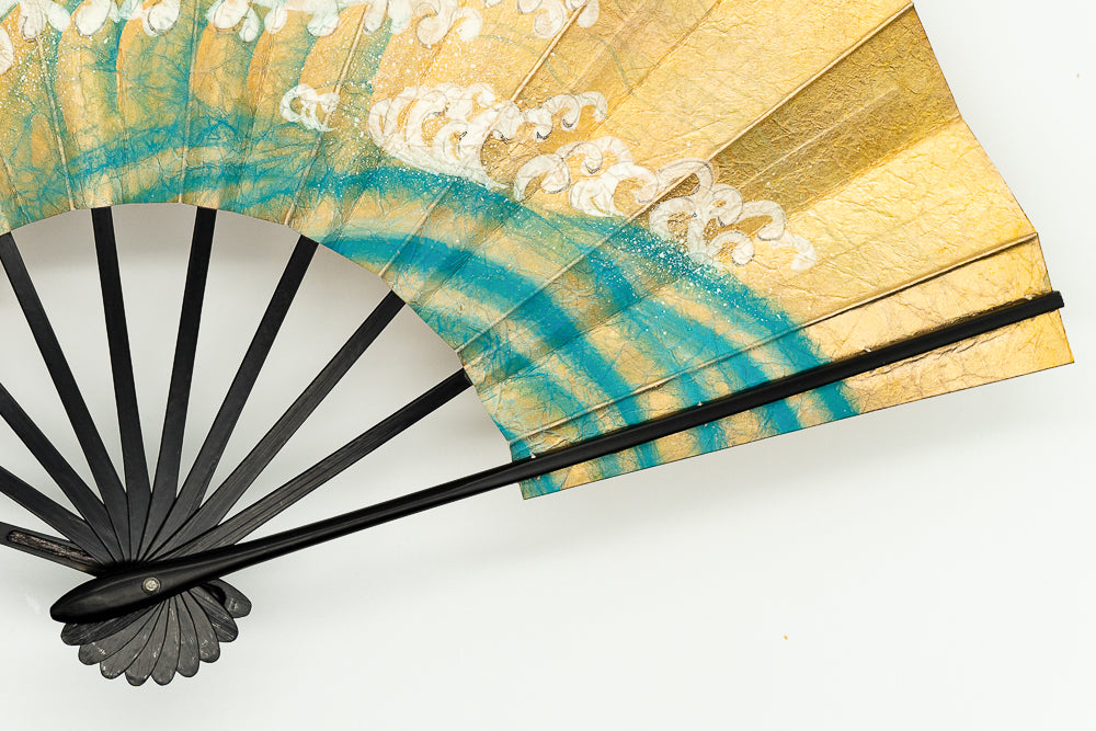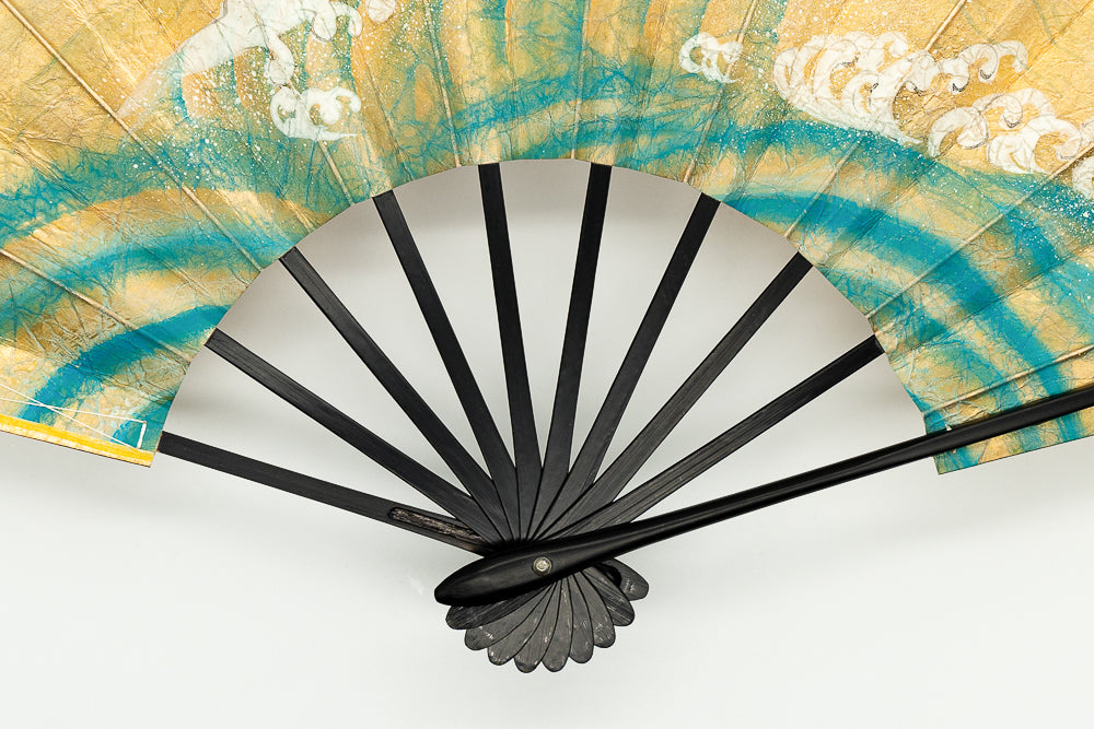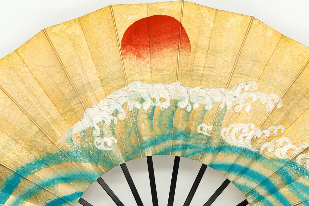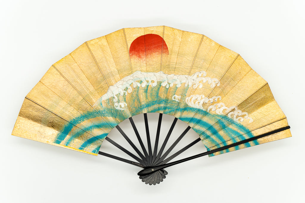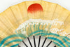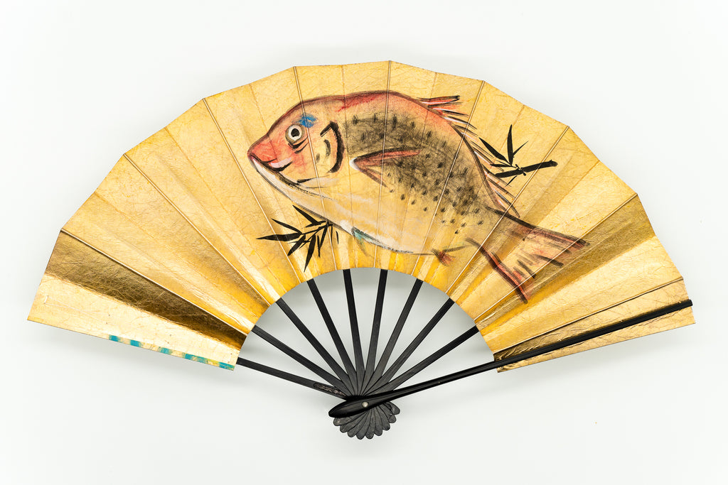 【一点もの・ビンテージ品】金箔を手で揉みこんで扇面に箔押した金もみ地に繊細なタッチで日の出が描かれています。裏面には鯛が描かれており、おめでたい雰囲気を醸し出しています。ゴールドが経年変化によりシックなお色味になっており、ビンテージ品らしい趣を楽しんで頂ける一品です。