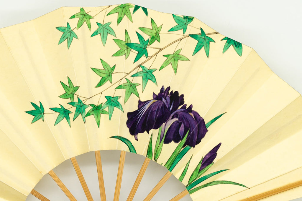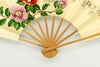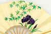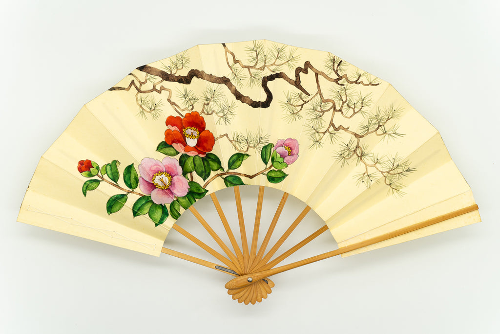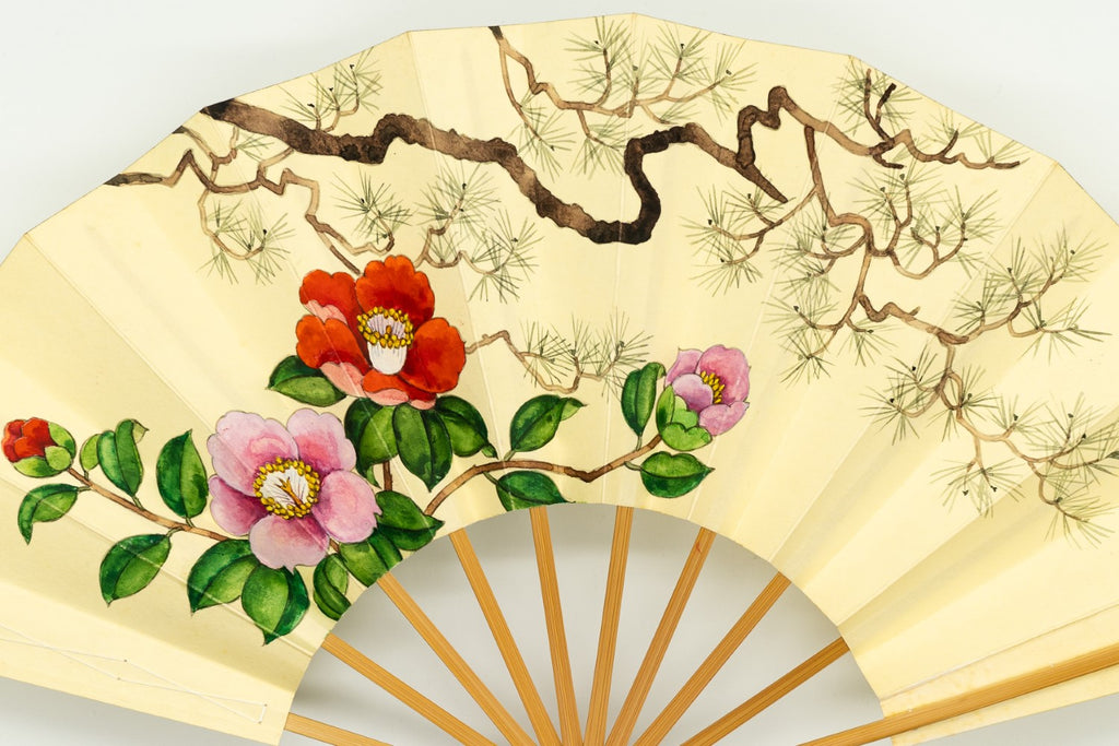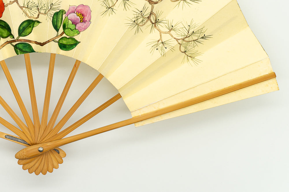 【ビンテージ】鳥の子地に可愛らしい赤とピンクの椿をあしらい、そこに松を合わせて個性的なデザインに仕仕上げました。もう片面は紅葉とあやめで爽やかな空気感が漂う一品です。