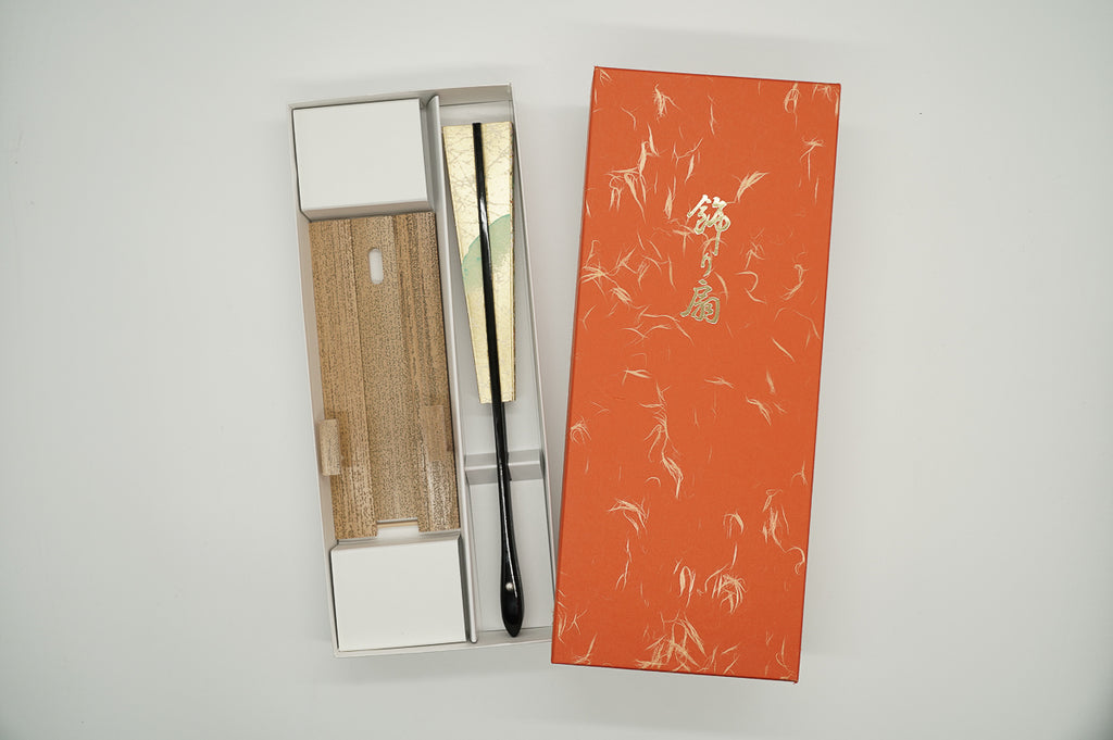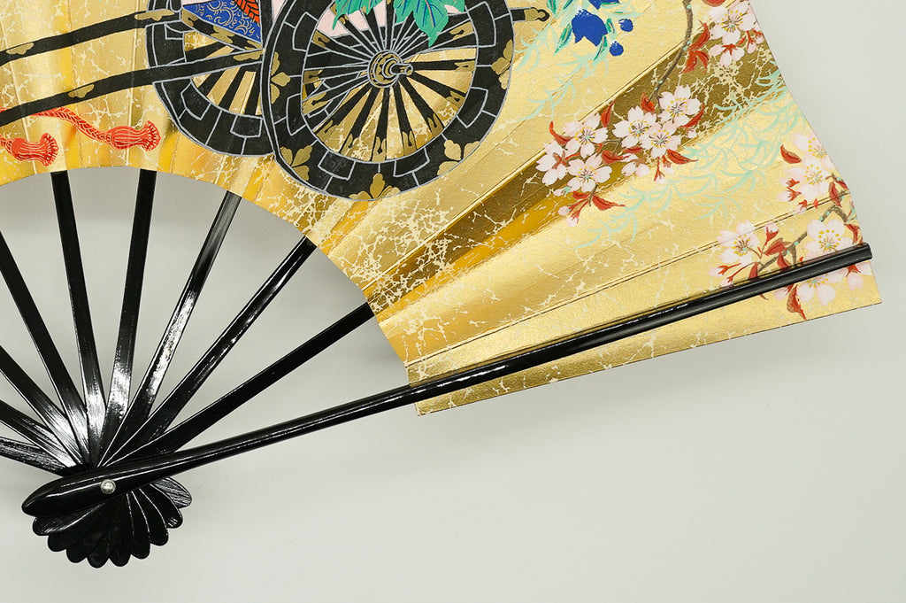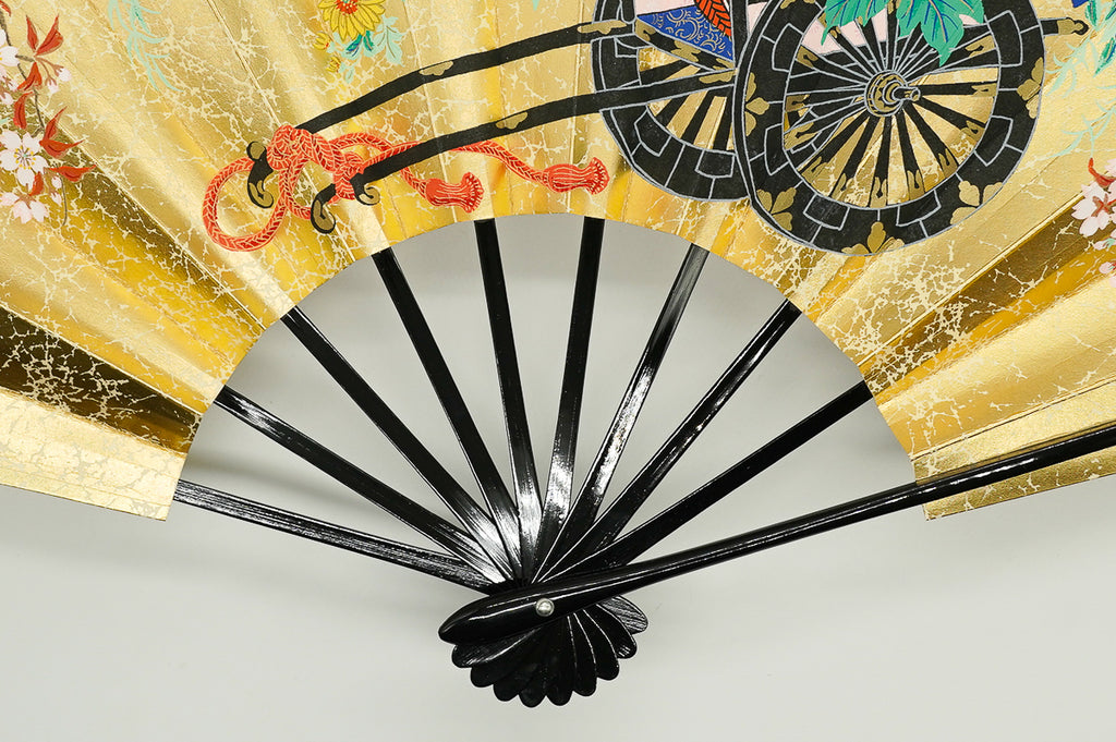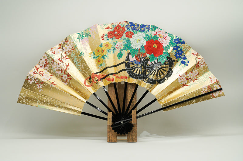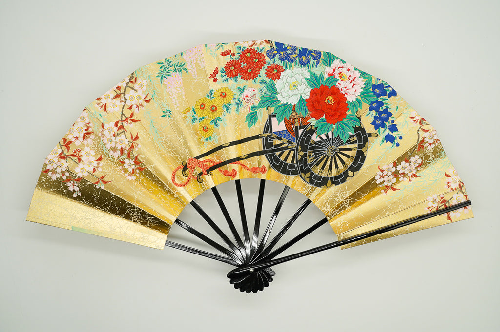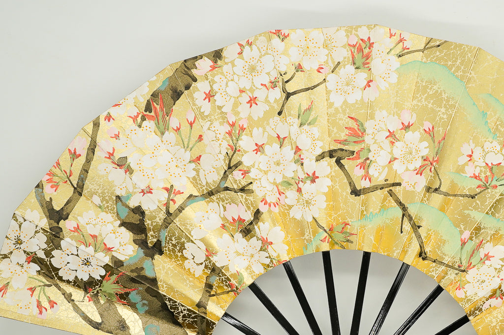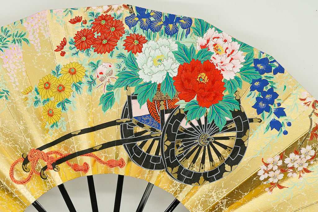 金もみ地の扇面に花車、もう片面には満開の桜が描かれています。華やかで贈物にもおすすめです。