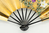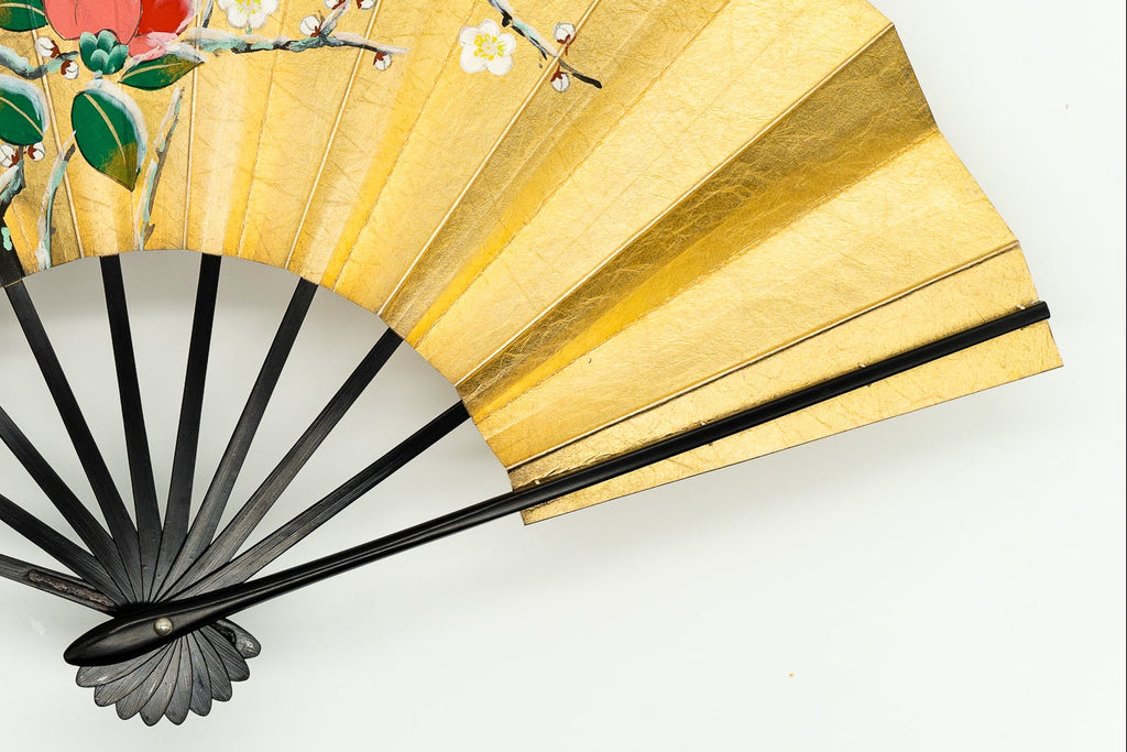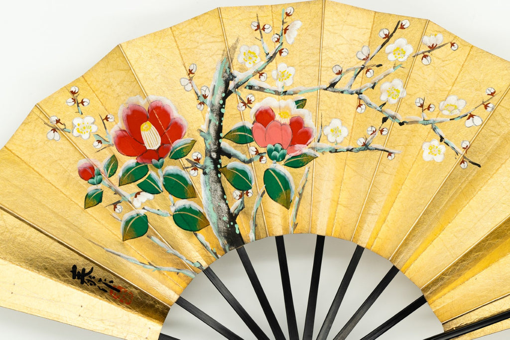 【一点もの・ビンテージ品】金箔を手で揉みこんで扇面に箔押した金もみ地に雪椿が手描きで描かれています。雪と白梅が可愛らしい椿の美しさを引き立たせています。もう片面には白と紫の桔梗が描かれています。用途に応じて両面お使い頂けます。ゴールドが経年変化によりシックなお色味になっており、ビンテージ品らしい趣を楽しんで頂ける一品です。